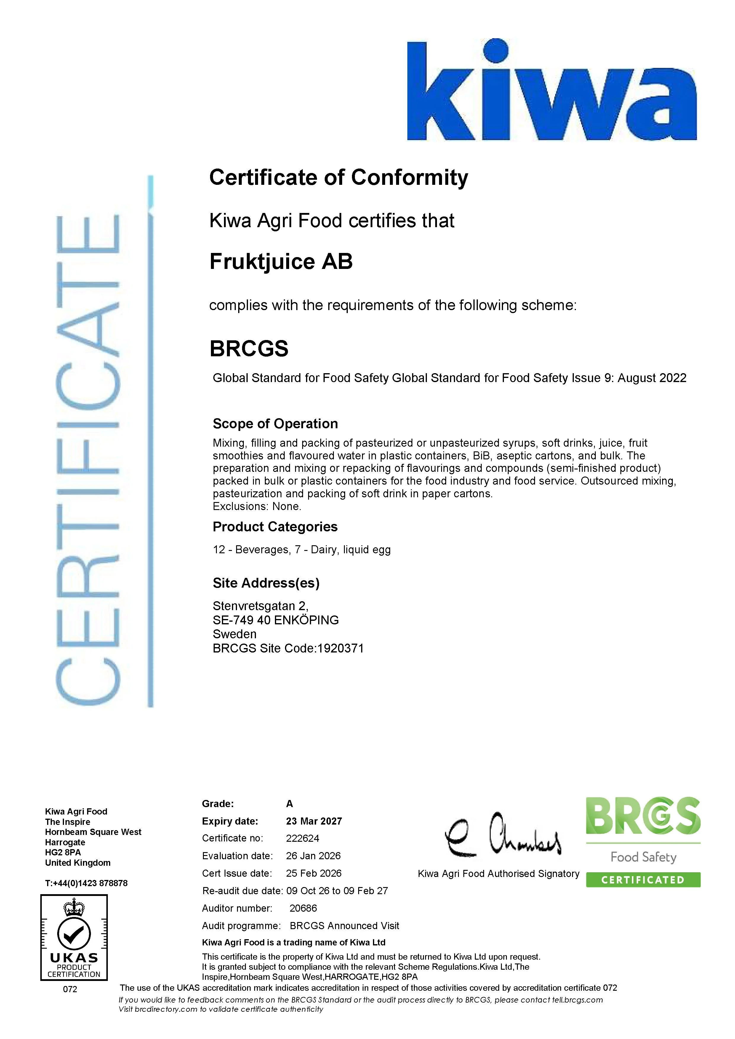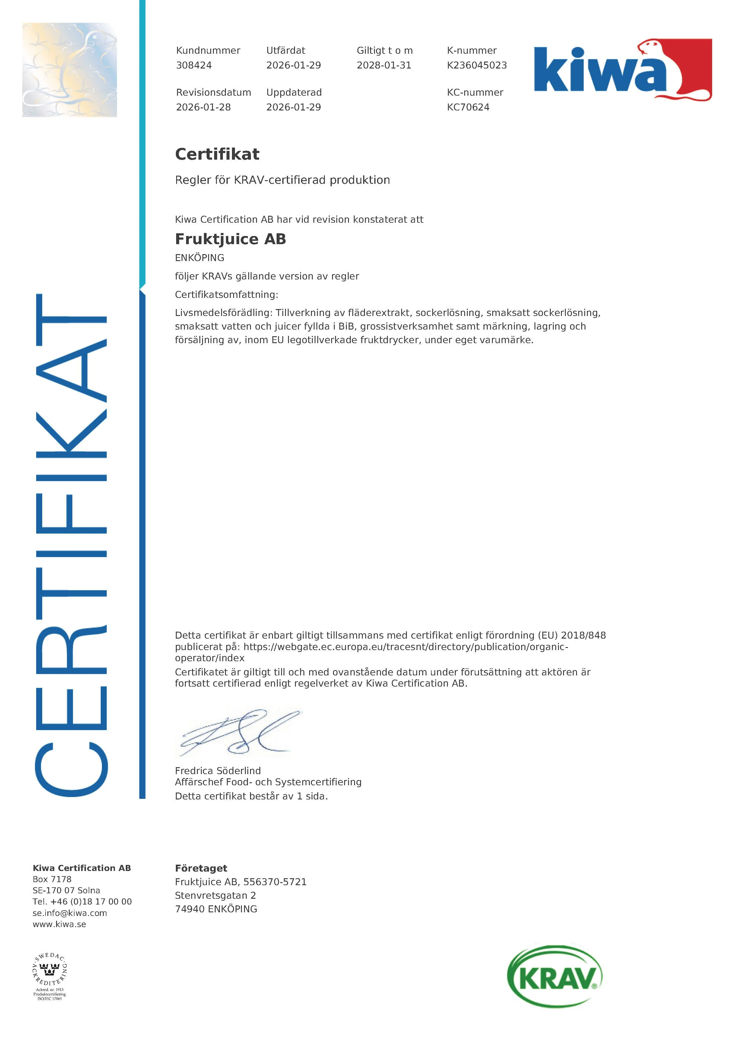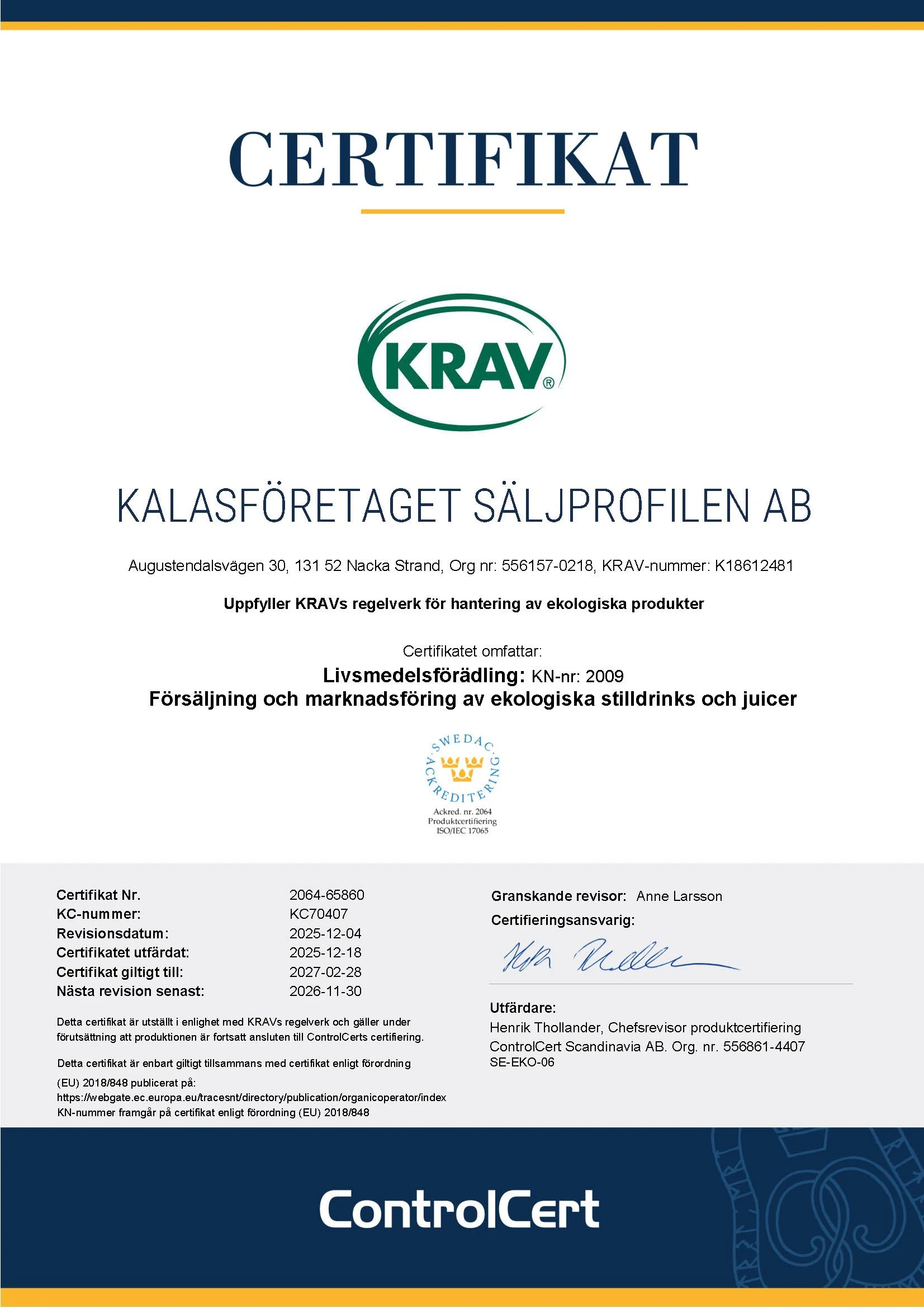 Kalasföretaget Säljprofilen AB, med varumärket Smakis, är certifierat för försäljning och marknadsföring av KRAV ekologiska stilldrinks och juicer
