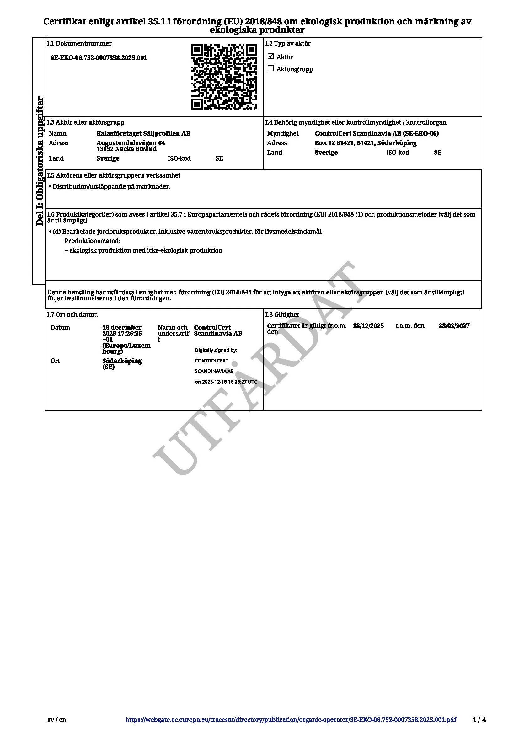 Kalasföretaget Säljprofilen AB är certifierat enligt artikel 35.1 i förordning (EU) 2018/848 om ekologisk produktion och märkning av ekologiska produkter